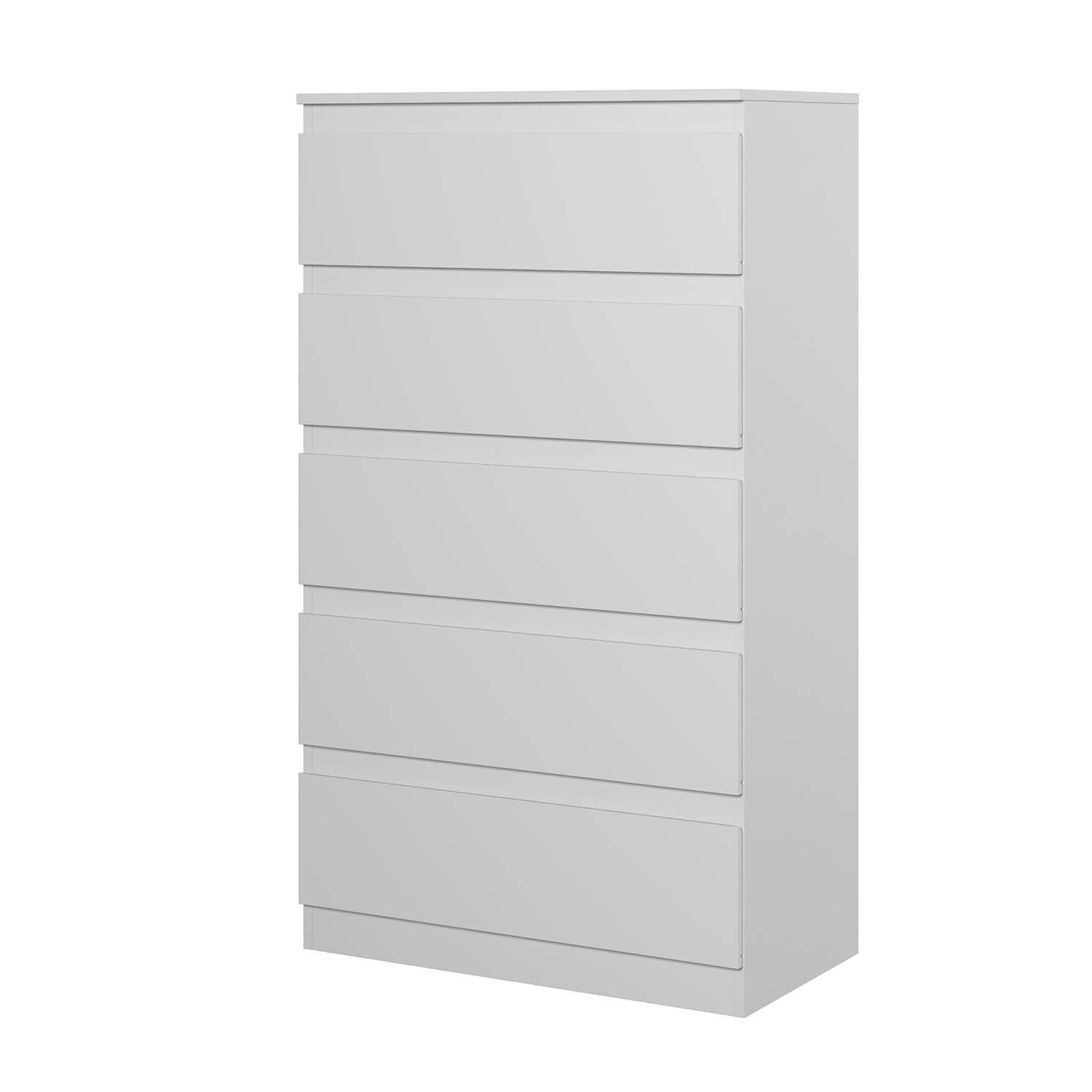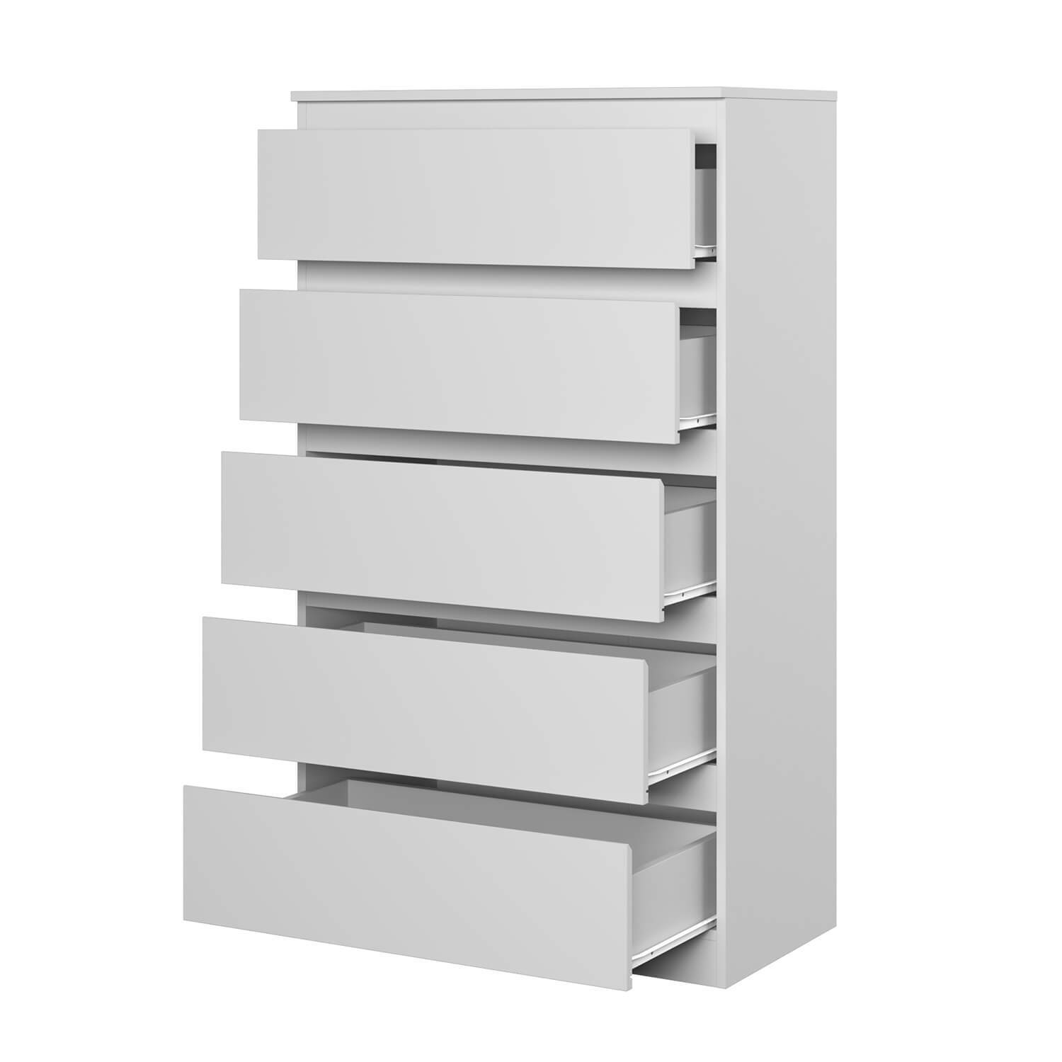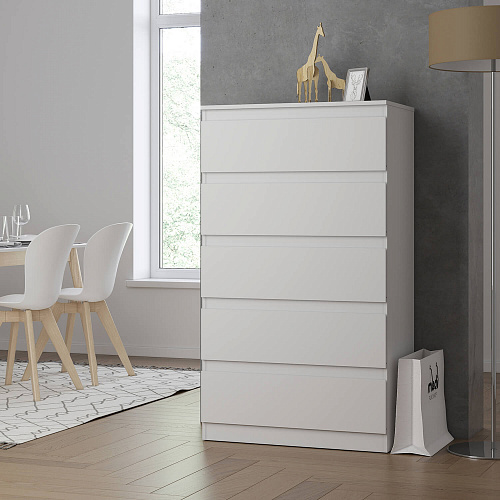 Функциональность: комод оснащен пятью ящиками, что позволяет хранить различные предметы и аксессуары. Роликовые направляющие обеспечивают плавное и бесшумное выдвижение ящиков.