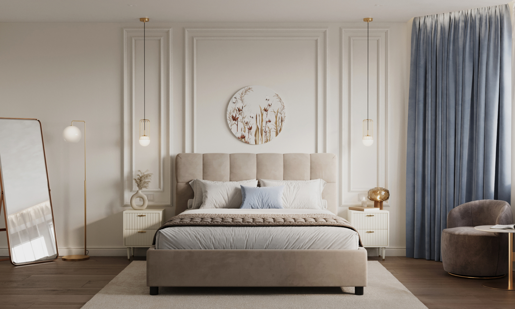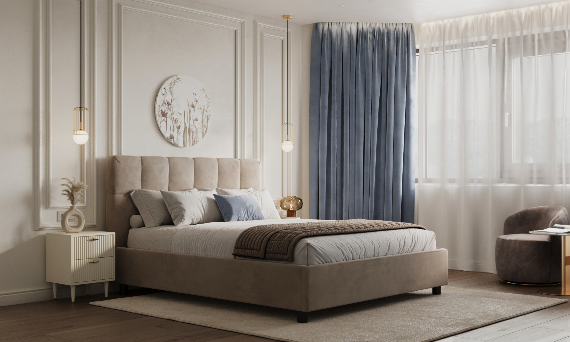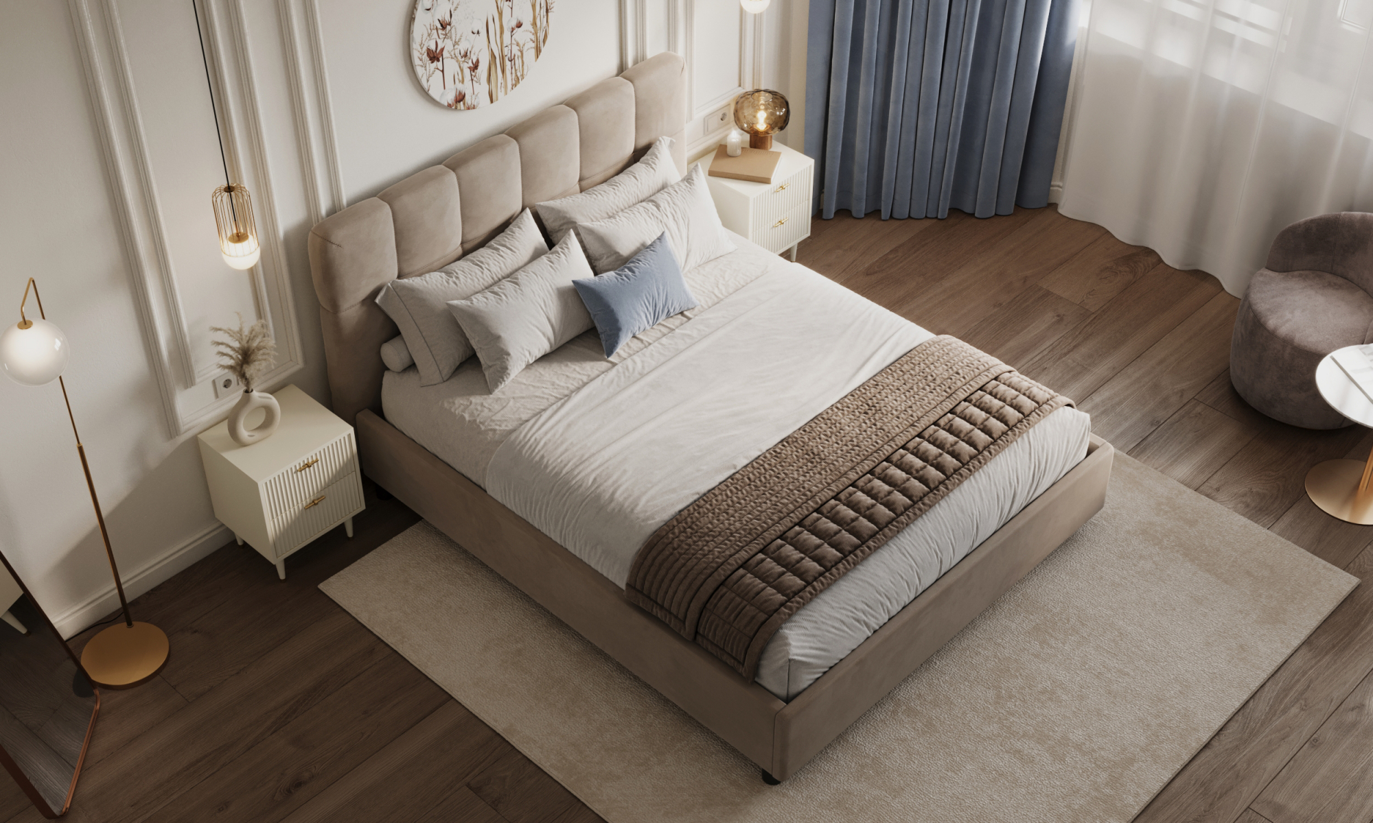 Современная кровать Голди в стиле минимализм с декоративной строчкой на изголовье может быть стилизована в скандинавский стиль спальни или современную классику благодаря лаконичному дизайну изголовья. Высокое изголовье кровати позволит Вам создать органичный комплект с высокими комфортными матрасами. Мягкие царги и углы у изножья уберегут от травм. Высота опор облегчает уборку: под кровать легко заезжает робот-пылесос.