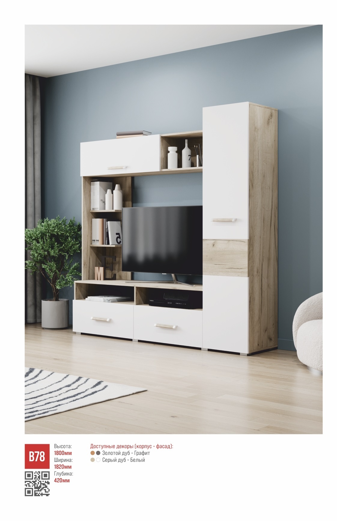 Гостиная "Виора", спроектированная по модульному принципу, отличается эффектным современным дизайном. Ее элементы словно невесомо парят в воздухе, и сочетание контрастных оттенков усиливает это впечатление. Дополнительную визуальную легкость стенке придают открытые полки и удобные ниши под телевизором. Два ящика под нишами выдвигаются вперед на шариковых направляющих полного выдвижения. Створки открываются с помощью четырехшарнирных петель без доводчиков. За створкой стеллажа скрываются пять одинаковых полок. Лаконичные ручки - из ПВХ, ширина - 192 мм. Регулируемые опоры из ПВХ позволяют добиться идеального баланса стенки, например, на неровном полу.