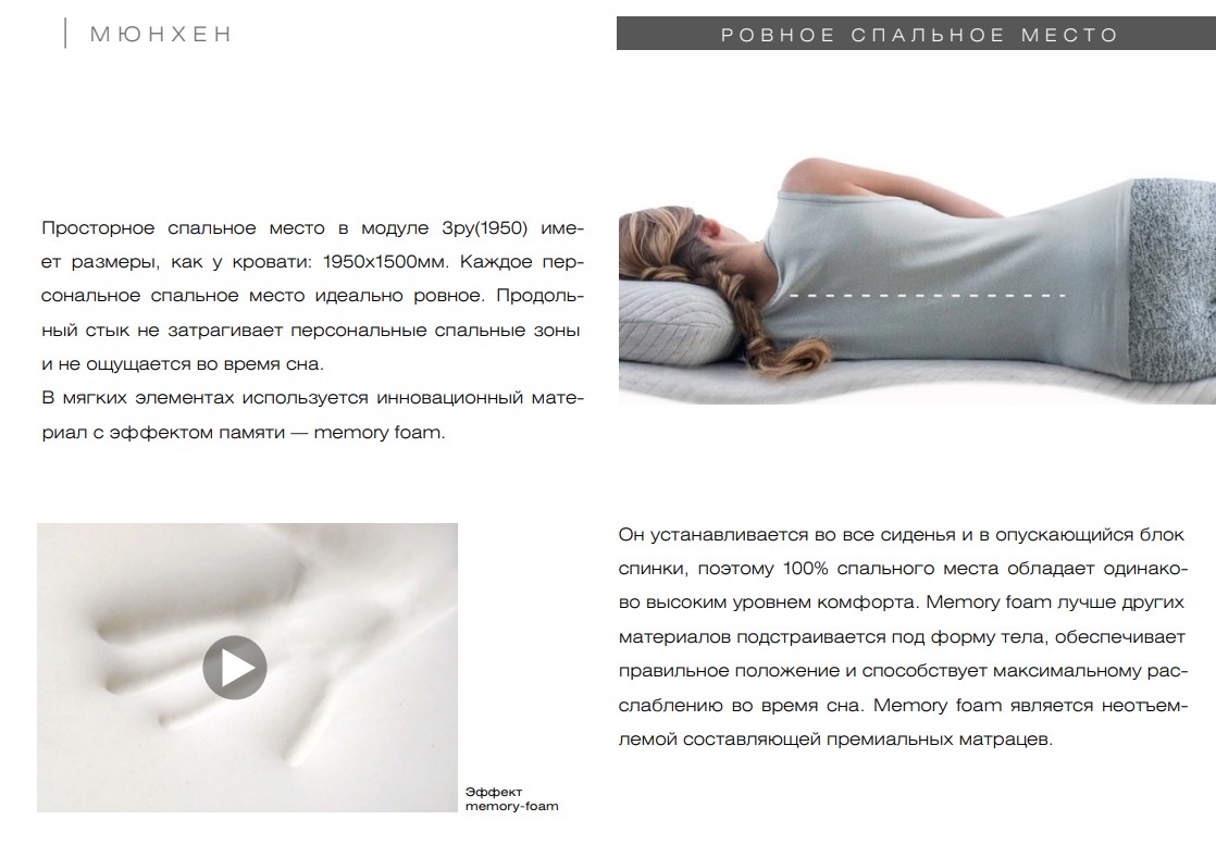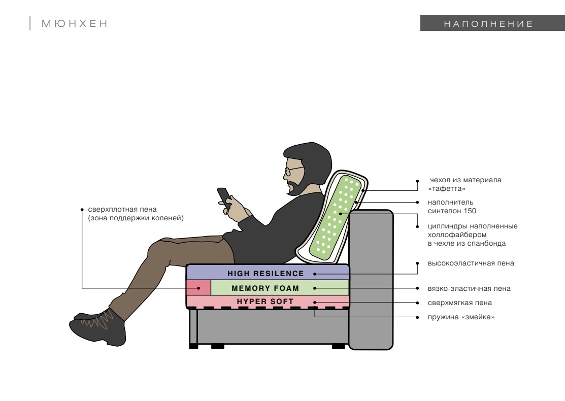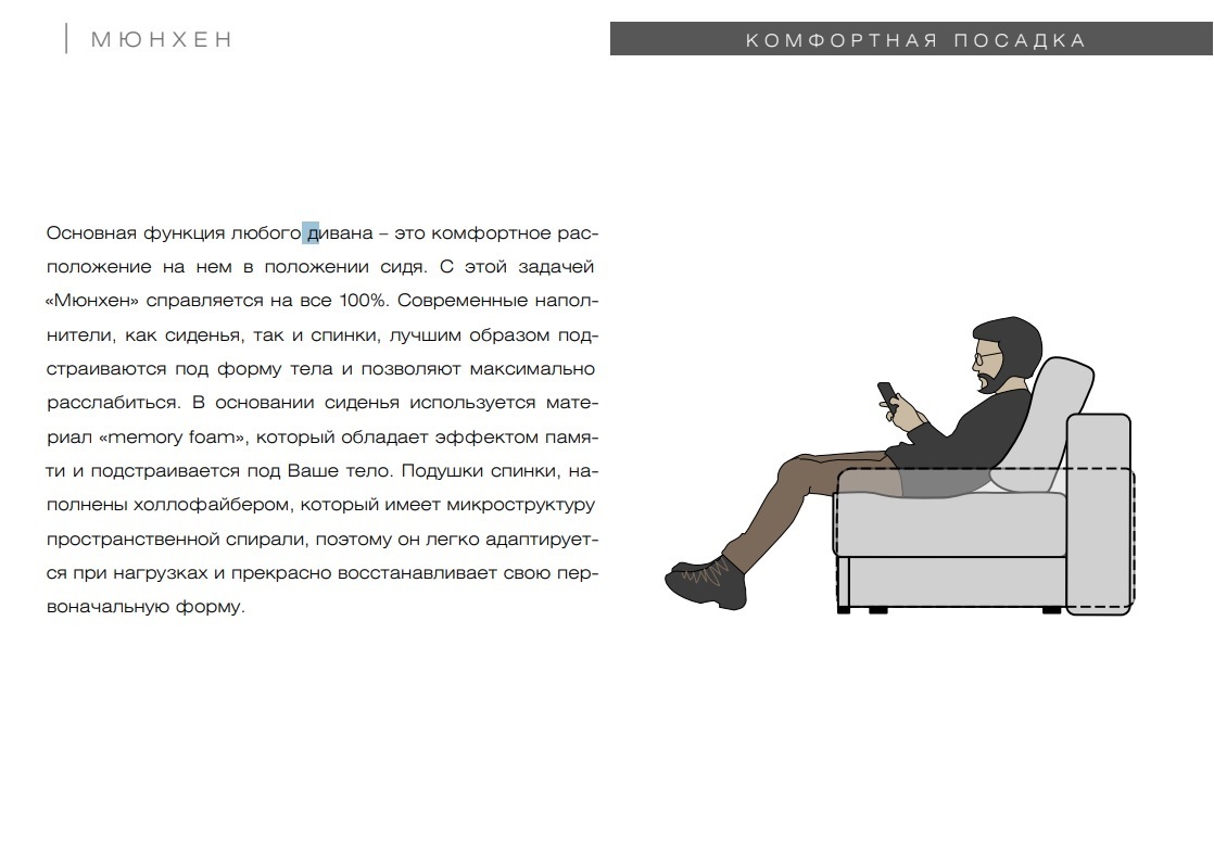 Мюнхен – диван европейского формата, в котором идеально сочетаются простые формы и высокий уровень комфорта. Дизайн модели универсален и легко адаптируется в любом современном интерьере. Присядьте на него, и Вы в полной мере ощутите его невероятный комфорт, который вызывает ощущение восторга и полного расслабления. Он словно обнимает Ваше тело. Отдельного внимания заслуживает ровное спальное место, в основе которого используется инновационный материал мемори фом - неотъемлемая составляющая премиальных матрацев.