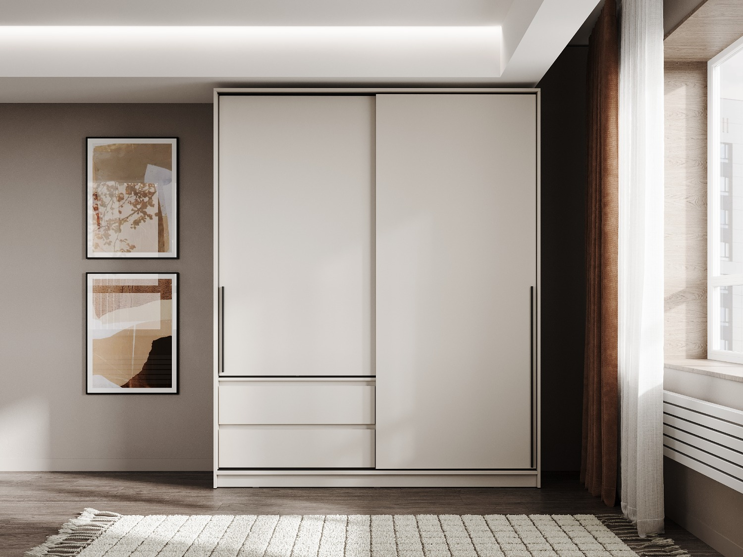Шкаф обладает внушительными габаритами: длина 1800 мм, высота 2200 мм и глубина 600 мм. Его массивность подчеркивает статус интерьера, а мягкий оттенок корпуса и фасадов создает атмосферу уюта и визуального спокойствия.