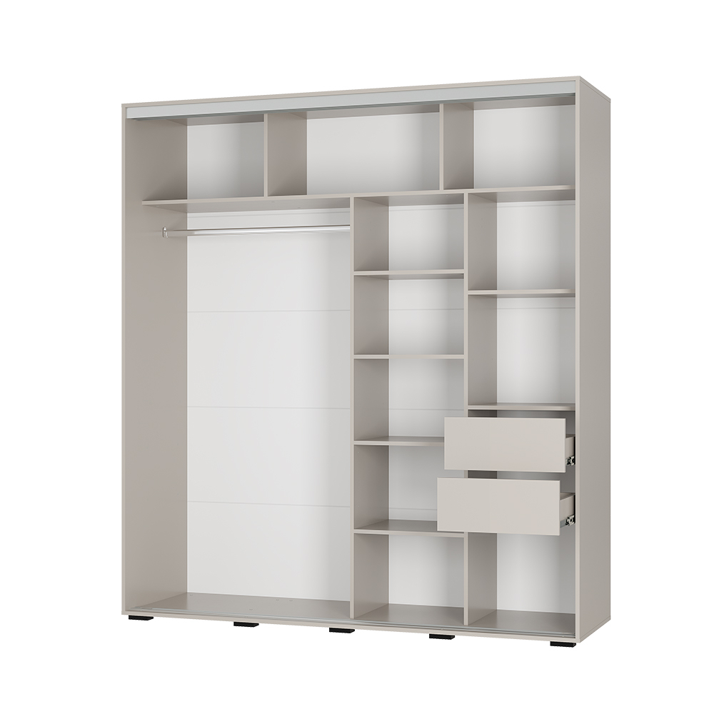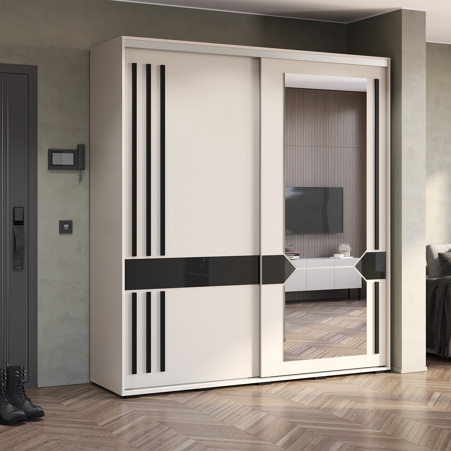 Шкаф украшен роскошным зеркалом с интересной геометрической формой, которое не только выполняет свою практическую функцию, но и становится изысканным акцентом.