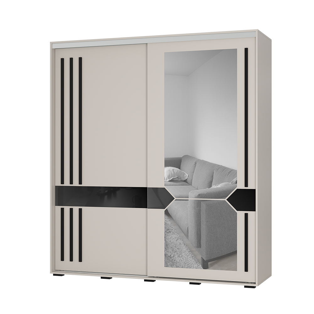 Двери шкафа оснащены стильными длинными вставками из черного МДФ - профиля, выполняющими роль ручек.