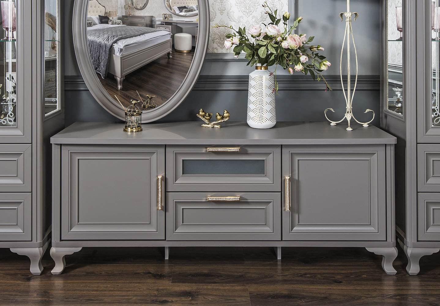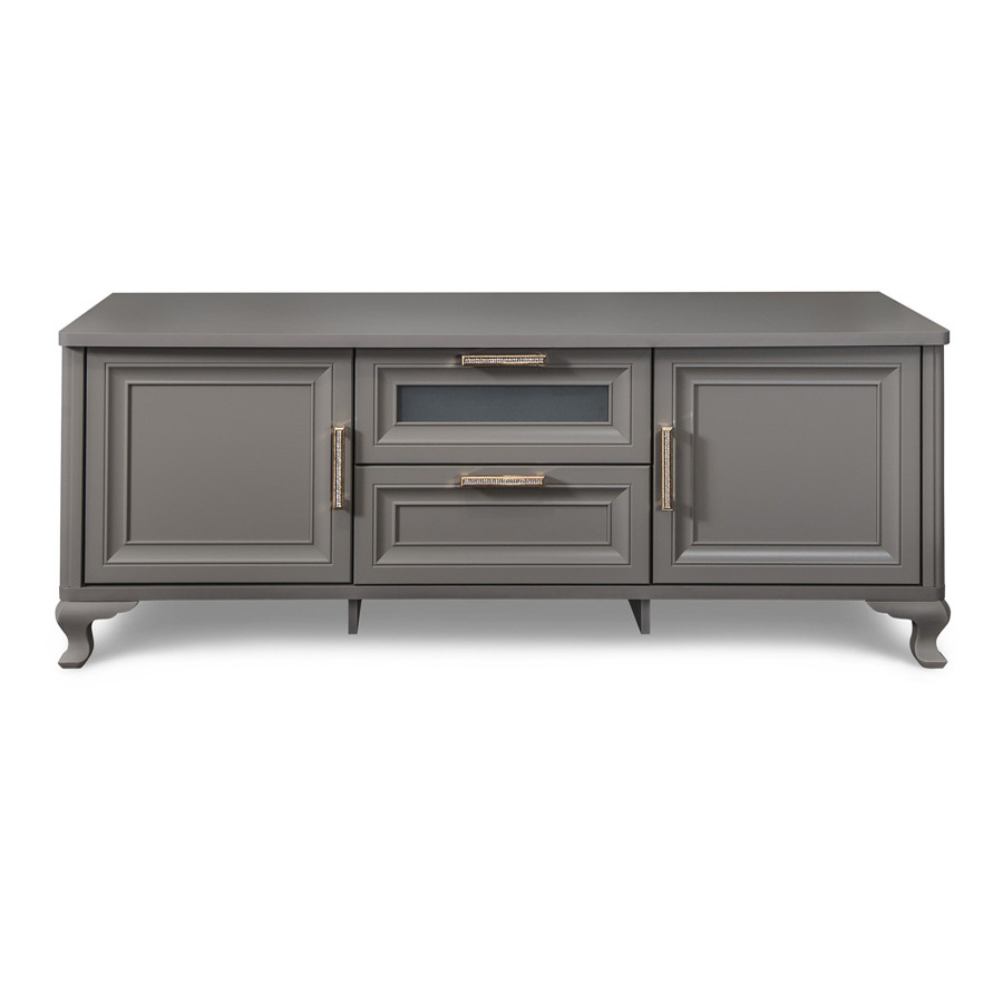 Тумба ТВ Мокко - классический модуль для гостиной, оснащен двумя выдвижными ящиками в центральной части и двумя отделениями за глухой распашной дверью по бокам. Модуль украшен изящными ножками-опорами, фасады - рамочным декором и красивыми латунными ручками со стразами.